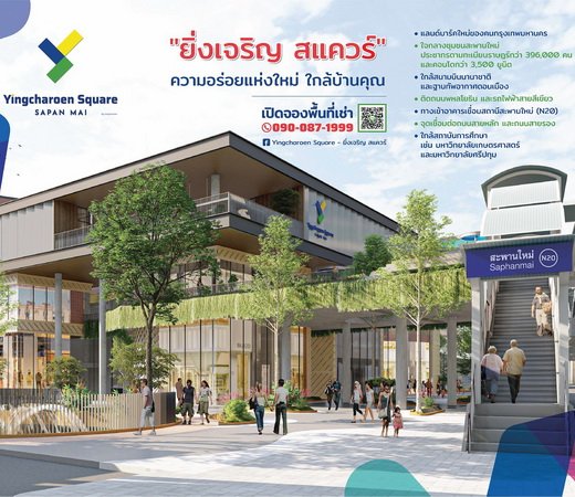 ตลาดยิ่งเจริญ เตรียมคิกออฟ “ยิ่งเจริญ สแควร์” สะพานใหม่-ดอนเมือง ภายใต้แนวคิด ความอร่อยแห่งใหม่ ใกล้บ้านคุณ เป็นอาคารสูง 4 ชั้น มีรูปแบบผสมผสานร่วมสมัย และเป็นมิตรกับสิ่งแวดล้อม เพิ่มพื้นที่เชิงพาณิชย์และพื้นที่พักผ่อนหย่อนใจ รวมกว่า 16,000 ตารางเมตร รองรับผู้ประกอบการ และร้านค้าอาหารที่หลากหลาย ท่ามกลางชุมชนขนาดใหญ่ที่ขยายตัวอย่างต่อเนื่องของกรุงเทพมหานครตอนเหนือ บนพื้นที่ติดถนนพหลโยธิน และรถไฟฟ้าสายสีเขียว เชื่อมสถานีสะพานใหม่ N20 ปักหมุดเป็น “แลนด์มาร์คแหล่งใหม่” ใจกลางชุมชนสะพานใหม่-ดอนเมือง สานต่อนโยบาย Yingcharoen Together ยิ่งเจริญไปด้วยกัน ศูนย์กลางชุมชนที่เชื่อมโยง เศรษฐกิจ สังคม การศึกษา และสิ่งแวดล้อม ตอบโจทย์ความต้องการผู้บริโภคที่หลากหลาย เปิดจองพื้นที่แล้ววันนี้