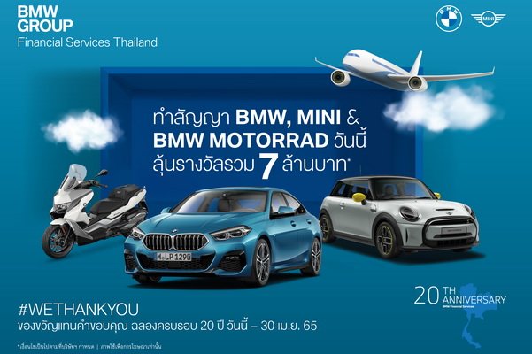 บีเอ็มดับเบิลยู ไฟแนนเชียล เซอร์วิส ประเทศไทย เฉลิมฉลองการเดินทางครบรอบ 20 ปี บนเส้นทางที่พาลูกค้าไปโลดแล่นกับแคมเปญสุดตระการตาสำหรับทุกแบรนด์ภายใต้บีเอ็มดับเบิลยู กรุ๊ป ด้วยรางวัลใหญ่สุดเอ็กซ์คลูซีฟหลายรายการ โดยลูกค้าที่ซื้อรถยนต์บีเอ็มดับเบิลยู มินิ หรือมอเตอร์ไซค์บีเอ็มดับเบิลยู มอเตอร์ราด พร้อมทำสัญญาทางการเงินกับบีเอ็มดับเบิลยู ไฟแนนเชียล เซอร์วิส ตั้งแต่ 1 พฤษภาคม 2564 ถึง 31 เมษายน 2565 จะได้สิทธิ์ร่วมลุ้นรางวัลสุดพิเศษ ทั้งรางวัลประจำเดือนและรางวัลใหญ่เพื่อร่วมเฉลิมฉลองในวาระครบรอบที่สำคัญยิ่งด้วยข้อเสนอสำหรับลูกค้าที่ดีที่สุดตลอดช่วง ทศวรรษที่ผ่านมานี้  โดยจะเริ่มจับรางวัลตั้งแต่วันที่ 15 ตุลาคม 2564 เป็นต้นไป