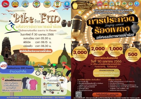 – 30 เมษายน 2566 : พบกับกิจกรรม Bike for Fun มหัศจรรย์เตาเผาแม่น้ำน้อย & การประกวดร้องเพลง มหัศจรรย์เตาเผาแม่น้ำน้อย Singing Contest & ศิลปิน ลิเก คอนเสิร์ต เอิร์ธ โฟร์เอส , เต๋า ภูศิลป์ , ฮาย ชุติมา , วงดนตรีน้องเมย์มิวสิคแบรนด์