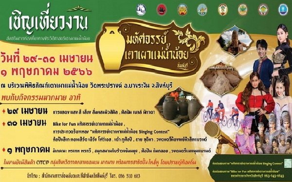 การท่องเที่ยวแห่งประเทศไทย (ททท.) สำนักงานลพบุรี ชวนร่วมงานส่งเสริมการท่องเที่ยวทางประวัติศาสตร์ “มหัศจรรย์เตาเผาแม่น้ำน้อย” ระหว่าง 29 เมษายน 2566 – 1 พฤษภาคม 2566 ณ บริเวณพิพิธภัณฑ์เตาเผาแม่น้ำน้อย วัดพระปรางค์ ตำบลเชิงกลัด อำเภอบางระจัน จังหวัดสิงห์บุรี ภายในงานพบกับกิจกรรมที่น่าสนใจมากมาย