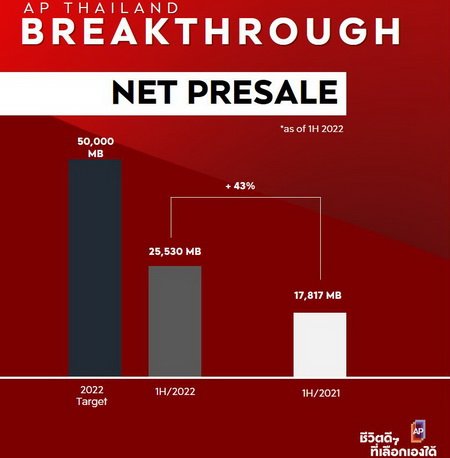 นายวิทการ จันทวิมล รองกรรมการผู้อำนวยการ สายงานกลยุทธ์องค์กรและการสร้างสรรค์ บมจ. เอพี ไทยแลนด์ กล่าวว่า ครึ่งปีแรกที่ผ่านมาถึงแม้ในขณะที่สถานการณ์การแพร่ระบาดจะเริ่มคลี่คลายลง แต่ทุกคนทั่วโลกกำลังต้องเผชิญกับภาวะเงินเฟ้อ ราคาสินค้าที่แพงขึ้นที่มีผลกระทบต่อระบบเศรษฐกิจแทบทุกประเทศ ซึ่งสิ่งที่เอพีทำมาโดยตลอดคือการมอนิเตอร์ทุกสถานการณ์อย่างใกล้ชิด เพื่อนำมาปรับแผนการทำงาน ตลอดจนการบริหารจัดการต้นทุน เพื่อคงราคาขายดังเดิมไม่ให้กระทบไปยังลูกค้าเรามากที่สุด ส่งผลให้ผลงานครึ่งปีแรกบริษัทฯ สร้างนิวเรคคอร์ดได้อีกครั้ง โดยมียอดขายมากถึง 25,530 ล้านบาท เพิ่มขึ้นกว่า 43% หากเทียบกับครึ่งปีก่อนหน้า โดยเฉพาะสินค้าซูเปอร์สตาร์อย่างบ้านเดี่ยวและทาวน์โฮมที่เติบโตแบบก้าวกระโดด ส่งผลให้ภาพรวมสินค้าแนวราบในครึ่งปีแรกเติบโตขึ้นกว่า 25% ขณะที่กลุ่มธุรกิจคอนโดมิเนียม ยอดขายก็ปรับตัวดีขึ้นกว่าเกือบ 3 เท่า ถือเป็นการส่งสัญญาณบวกที่ดีให้กับตลาดฯ ทั้งหมดเป็นการเติบโตแบบ Organic Growth สะท้อนให้เห็นถึงศักยภาพในการวางแผนองค์กรให้พร้อมตั้งรับกับทุกสภาวะได้อย่างชัดเจน