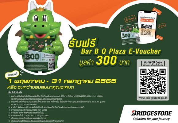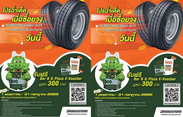 บริษัท บริดจสโตนเซลส์ (ประเทศไทย) จํากัด จัดโปรโมชั่นพิเศษเอาใจสายปิ้งย่าง กับโปรฉ่ำเด็ด เพียงซื้อผลิตภัณฑ์ยาง “DURAVIS R624 HEAVY DUTY” จำนวน 2 เส้นขึ้นไป และลงทะเบียนรับประกันยาง รับฟรี Bar B Q Plaza E-Voucher มูลค่า 300 บาท เพียงลูกค้าลงทะเบียนรับสิทธิ์ โดยสแกน QR Code หรือลงทะเบียนผ่านเว็บไซต์ www.bridgestone.co.th ได้ตั้งแต่วันที่ 1 พฤษภาคม – 31 กรกฎาคม 2565 หรือจนกว่าของสมนาคุณจะหมด