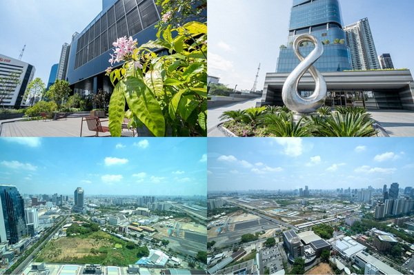 นอกจากนี้ตัวอาคารยังมีการใช้เส้นสายโค้งเว้าและบิดทิศอาคารอย่างเป็นสัดส่วน เป็นสัญลักษณ์ของ ‘ธาตุน้ำ’ สื่อถึงการสื่อสาร การปรับตัว และโอกาสใหม่ ๆ จึงช่วยเสริมธุรกิจการค้าขายทางไกลหรือธุรกิจระหว่างประเทศ นอกจากนี้ การออกแบบอาคารให้มีพื้นที่สีเขียวยังสะท้อนถึงพลังของ ‘ธาตุไม้’ ที่หมายถึงการเจริญเติบโต พลังแห่งชีวิต และความคิดสร้างสรรค์ จึงหนุนธุรกิจกลุ่มนวัตกรรม สุขภาพ เวลเนส ความงาม แฟชั่น และการศึกษาได้อย่างดีเยี่ยม เมื่อนำธาตุที่ส่งเสริมกันอย่าง ทอง น้ำ และไม้ มารวมไว้ด้วยกัน จึงก่อให้เกิดความสมดุลสูงสุด ทั้งในแง่ของความมั่นคง ความยืดหยุ่น การปรับตัวได้ดี และการเติบโตในระยะยาว ตอบโจทย์การเป็นพื้นที่แห่งความสำเร็จของธุรกิจในหลากหลายอุตสาหกรรม”
