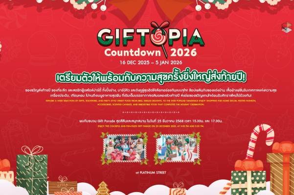 นย์การค้าแพลทินัม ชวนร่วมงาน “GIFTOPIA Countdown 2026” ตั้งแต่วันนี้ถึง 5 มกราคม 2569 สัมผัสบรรยากาศแห่งความสุขด้วยการยกขบวนของขวัญ ของฝาก มาให้เลือกช้อปอย่างจุใจ ทั้งของที่ระลึก ของตกแต่งบ้าน เสื้อผ้าแฟชั่น เครื่องประดับ พร้อมอิ่มอร่อยกับสตรีทฟู้ดสไตล์ปาร์ตี้ อาทิ บาร์บีคิวปิ้งย่าง เมนูสารพัดยำ ปลาหมึก – กุ้งชุบแป้งทอด ถั่วถอด ขนมหวาน ผลไม้สดและแปรรูปอีกมากมายชมขบวน Gift Parade สุดสนุก ในวันที่ 25 ธันวาคม 2568 เวลา 15.30 น. และ 17.30 น. บริเวณ Platinum Street