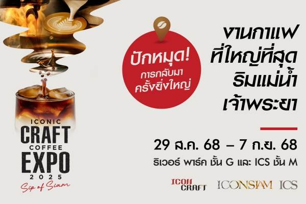 คนรักกาแฟพลาดไม่ได้ 29 สิงหาคม – 7 กันยายน 2568 นี้ มาดื่มด่ำกับกาแฟแก้วพิเศษ และร่วมเป็นส่วนหนึ่งในการขับเคลื่อนวัฒนธรรมกาแฟไทยให้เติบโตอย่างยั่งยืนใน “ICONIC CRAFT COFFEE EXPO 2025” ณ ริเวอร์ พาร์ค ชั้น G ไอคอนสยาม, ชั้น M ไอซีเอส และ ชั้น 4 ไอคอนคราฟต์ สอบถามรายละเอียดเพิ่มเติม โทร.1338 หรือ www.iconsiam.com และ Facebook:ICONSIAM