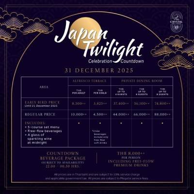 Early bird discounts apply for bookings made from November 15 to December 21, 2025. To book your place at the New Year’s Eve celebrations, please visit https://megatix.in.th/events/japan-twilight-celebration-countdown
