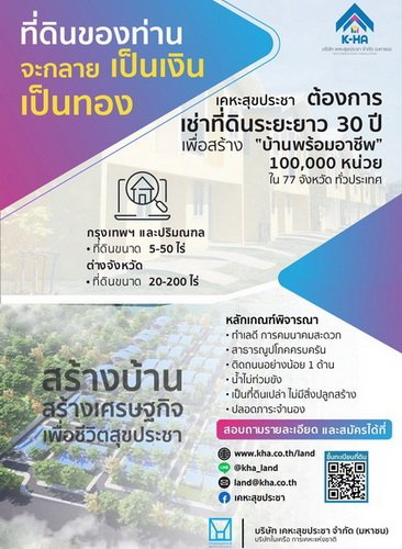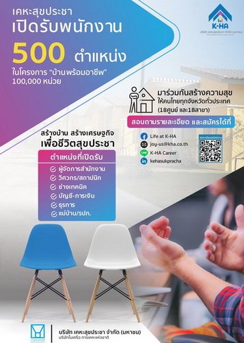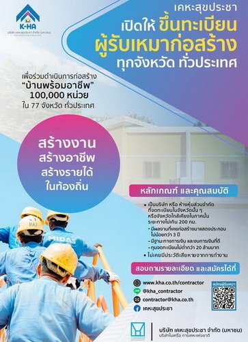 บริษัท เคหะสุขประชา จำกัด (มหาชน) หรือ K-HA ในเครือการเคหะแห่งชาติ เดินหน้าสวนสภาวะเศรษฐกิจเปิด 3 โอกาสสุดยิ่งใหญ่เพื่อคนไทยทุกคน ประกาศรับสมัครงาน 500 อัตรา และขึ้นทะเบียนผู้รับเหมา และผู้ที่มีที่ดินให้เช่าระยะยาว 30 ปี เพื่อรองรับโครงการบ้านเช่า “บ้าน พร้อมอาชีพ” 100,000 หน่วย!! ทั่วประเทศ สำหรับผู้มีรายได้น้อย และกลุ่มเปราะบาง