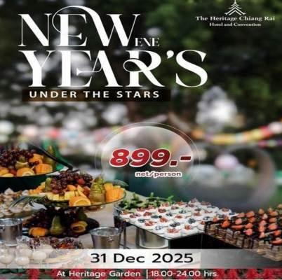 เชียงราย :โรงแรม The Heritage Chiang Rai Hotel & Convention ขอเชิญร่วมเฉลิมฉลองคืนส่งท้ายปีเก่า ต้อนรับปีใหม่ 2569 กับกิจกรรม “New Year’s Eve Under the Starsดินเนอร์บุฟเฟต์ส่งท้ายปีท่ามกลางบรรยากาศสวนยามค่ำคืน ณ Heritage Garden ในวันพุธที่ 31 ธันวาคม 2568 ตั้งแต่เวลา 18.00 – 24.00 น.