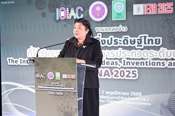 วันที่ 7 พฤศจิกายน 2568 สำนักงานการวิจัยแห่งชาติ(วช.) กระทรวงการอุดมศึกษา วิทยาศาสตร์ วิจัยและนวัตกรรม จัดการแถลงข่าวผลงานสิ่งประดิษฐ์ไทยที่ได้รับรางวัลจากเวที “The International Trade Fair-Ideas, Inventions and New Products” (iENA 2025) โดย ดร.วิภารัตน์ ดีอ่อง ผู้อำนวยการสำนักงานการวิจัยแห่งชาติ เป็นประธานในพิธี ณ ศูนย์ข้อมูลสารสนเทศกลางด้านวิทยาศาสตร์ วิจัยและนวัตกรรมของประเทศ สำนักงานการวิจัยแห่งชาติ