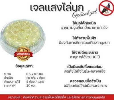 เจลแสงไล่นก เป็นนวัตกรรมระดับโลก ผลิตจากไขของน้ำมันสมุนไพร (Organic) เป็นมิตรกับสิ่งแวดล้อม Net Zero มีอายุการใช้งานยาวนานถึง 10 ปี ติดตั้งได้ทั้งในร่ม-กลางแจ้ง ไม่บดบังทัศนียภาพ ขนาด 5 เซนติเมตรสามารถซ่อนสายตาในการมองได้เป็นอย่างดี ปลอดภัยต่อคนและสัตว์เลี้ยง ไล่นกได้ทุกชนิด รวมถึงค้างคาว นอกจากนี้ยังทนทุกสภาพอากาศ แม้แดดแรงเพียงใด หรือฝนตกหนักแค่ไหน ก็ไม่ทำให้เนื้อเจลเสียสภาพได้ และเป็นผลิตภัณฑ์เดียวในท้องตลาดที่กล้ารับประกันผลงานและประสิทธิภาพถึง 2 ปี (2 years warranty) ซึ่งไม่มีสินค้าใด ๆ ในท้องตลาดรับประกันว่าป้องกันนกได้ เจลแสงไล่นก เป็นเทคโนโลยีป้องกันนกที่ใช้หลักการทางธรรมชาติ โดยเปลี่ยนแปลงสภาพแวดล้อมที่นกเคยอาศัยอยู่ ให้ไม่เหมาะสมกับการอยู่อาศัยของนก โดยจะรบกวนประสาทสัมผัสหลายทิศทางพร้อมกัน ทำให้นกไม่สามารถปรับตัวอยู่ในพื้นที่เดิมได้อีก โดยมี 4 หลักการ คือ