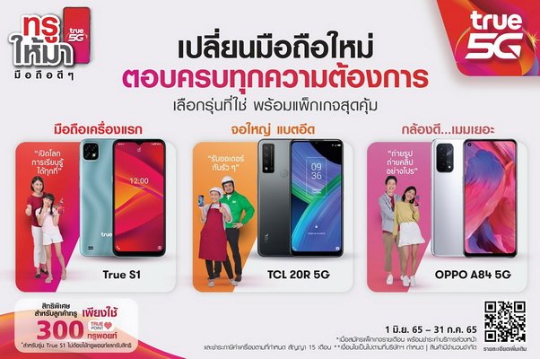 เพียงสมัครหรือใช้แพ็กเกจรายเดือนเริ่มต้น 399 บาท ระยะสัญญา 15 เดือน พิเศษยิ่งขึ้น!! สำหรับลูกค้าทรูเพียงใช้ 300 ทรูพอยท์ แลกรับเครื่องทันที ส่วนลูกค้าทั่วไปสามารถรับเครื่อง True S1 หรือนำเครื่องเก่ารุ่นใดมาแลกรับเครื่องใหม่ได้แทนการใช้พอยท์ ตั้งแต่วันนี้จนถึงวันที่ 31 กรกฎาคม 2565 (ยกเว้น OPPO A74 ถึงวันที่ 30 มิถุนายนเท่านั้น) ที่ ทรูช็อปทุกสาขา และทรูช็อปในเซเว่น อีเลฟเว่น โลตัส แม็คโคร และตัวแทนทรูที่ร่วมรายการทั่วประเทศ