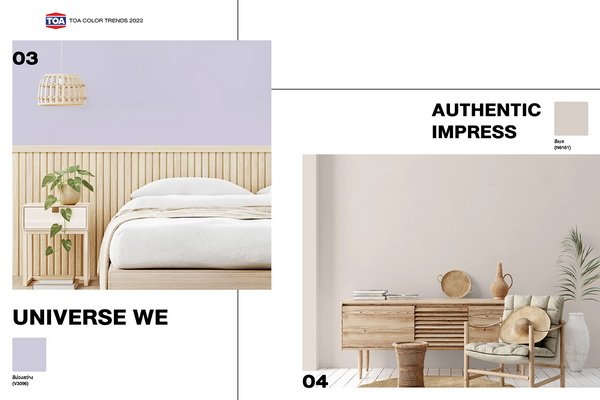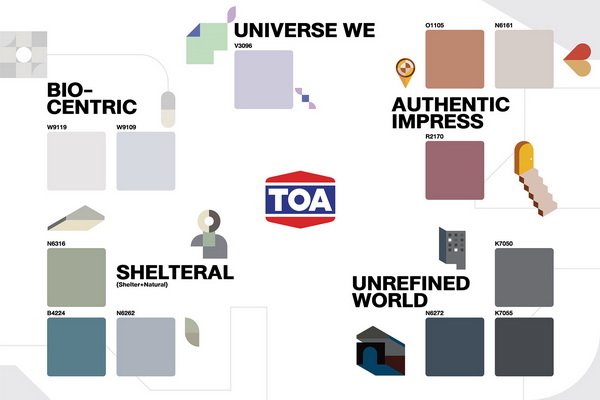 โดยผู้เชี่ยวชาญของทีโอเอ ได้นำแนวคิดดังกล่าวจากเหล่าสถาปนิกมาวิเคราะห์ จนออกมาเป็น Trendscope 5 กลุ่มเทรนด์สีใหม่ได้อย่างลงตัว (TOA COLOR TRENDS 2022) ประกอบด้วย 1. กลุ่มสีขาวสะอาดตา หรือ BIO-CENTRIC (เฉดสี W9119, W9109)