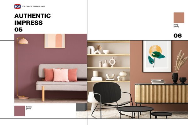 ใแนวคิด Hygienic Design เน้นความปลอดโปร่ง และการยกระดับสุขภาวะทางกายและใจที่ดี คำนึงถึงความยั่งยืนของธรรมชาติและสิ่งแวดล้อม 2.กลุ่มสีม่วงสว่าง หรือ UNIVERSE WE (เฉดสี V3096) สะท้อนถึงความเป็นหนึ่งเดียวไม่แบ่งแยก หรือเป็นสีของทุกสรรพสิ่งบนโลก 3.กลุ่มสีเบจ แดงหม่น ส้มอิฐ หรือ AUTHENTIC IMPRESS (เฉดสี N6161, R2170, O1105) กลุ่มสีที่เป็นแทนของการให้ความสำคัญถึงวัฒนธรรมและขนบธรรมเนียม สะท้อนเห็นถึงการผสมผสานความเก่าและใหม่ 4.กลุ่มสีฟ้าตุ่น เทากลาง และเขียวอ่อน หรือ SHELTERAL (เฉดสี B4224, N6262, N6316) ให้ความรู้สึกสงบและสบายใจแล้ว ช่วยลดทอนความตึงเครียดและเพิ่มความผ่อนคลาย 5.กลุ่มสีเทาเข้ม นํ้าเงินเข้ม และสีดำ หรือ UNREFINED WORLD (เฉดสี K7050, N6272, K7055) กลุ่มสีที่แสดงถึงความเรียบเท่สไตล์โมเดิร์น สะท้อนความรู้สึกถึงสัจจะแท้จริงของโลกในปัจจุบัน ผ่านการตีความความงามของโลกที่ไม่สมบูรณ์แบบ ความดิบ และความขรุขระของสัจจะวัสดุ เชิดชูความเป็นเอกลักษณ์ และความแตกต่างที่สามารถอยู่ร่วมกันได้อย่างมีความหมาย