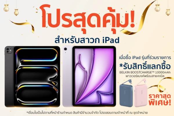 เมื่อซื้อ iPad Pro M5 หรือ iPad Air M3 รับสิทธิ์แลกซื้อ พาวเวอร์แบงค์ Belkin BOOST CHARGE™ ความจุ 10,000 mAh พร้อมสายเคเบิล ในราคาพิเศษเพียง 690 บาท จากราคาปกติ 1,490 บาท เพิ่มความสะดวกสบายในการใช้งานทุกที่ทุกเวลา