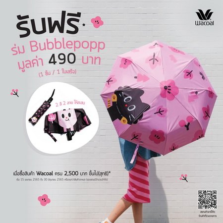ร่ม Bubblepopp สามารถป้องกันรังสียูวีจากแสงแดด กันฝนทนลมแรง พับเก็บง่ายพกพาสะดวก โปรโมชันแถมฟรีที่เลือกเฉพาะของพรีเมี่ยมดีๆ มีจำนวนจำกัด เริ่ม 15 เมษายน – 30 มิถุนายน 2565 (หรือจนกว่าสินค้าจะหมด) ณ วาโก้ช็อปและเคาน์เตอร์วาโก้ สาขาที่ร่วมรายการ
